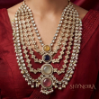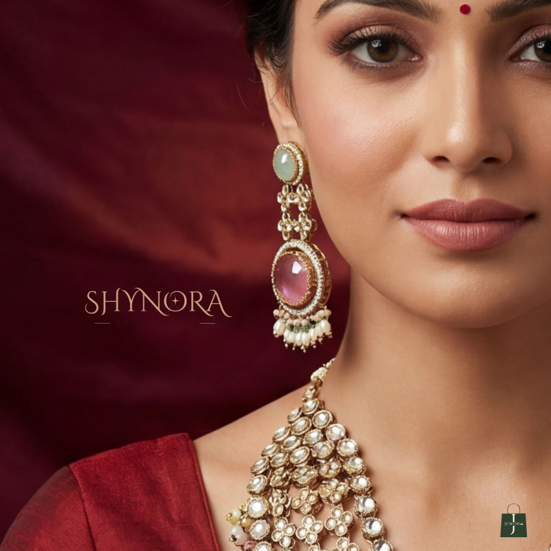Delicate pearl and bead drops add graceful movement, while the intricate gold-tone kundan setting enhances its royal appeal. The set is paired with matching long earrings and a coordinated maang tikka, making it a complete show-stopping ensemble.