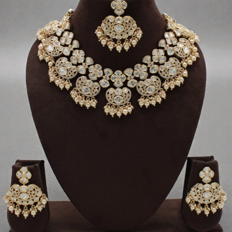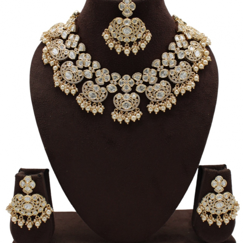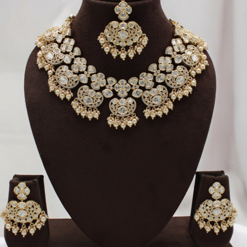 Each motif is adorned with delicate pearl drops that add graceful movement and royal charm. The set includes matching chandbali-style earrings and a coordinated maang tikka, making it a complete bridal ensemble. Perfect for weddings, receptions, and grand festive occasions.