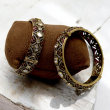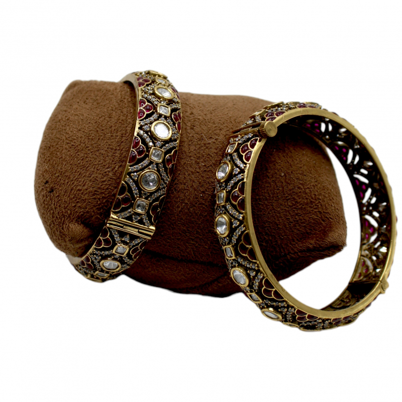 Elevate your festive look with these exquisite Kundan kada bangles, beautifully crafted in antique gold polish. The design features detailed red enamel (meenakari) patterns combined with sparkling white Kundan stones and fine black bead accents for a rich royal finish. The structured kada style with intricate stone placement gives it a bold yet elegant appearance. Perfect for weddings, festive celebrations, and traditional occasions, these bangles add timeless charm to any ethnic ensemble.