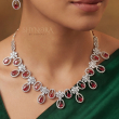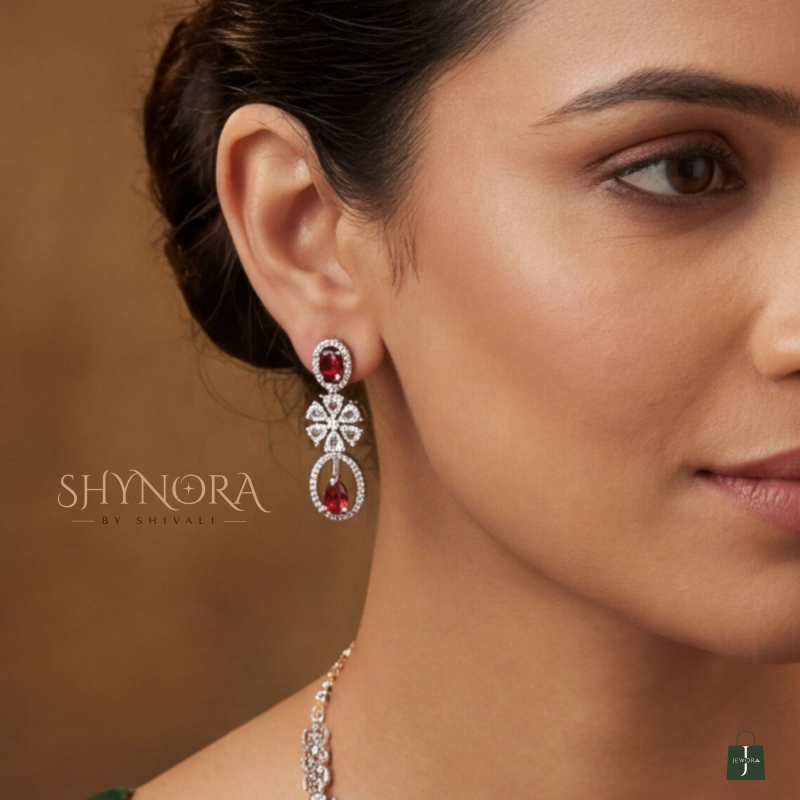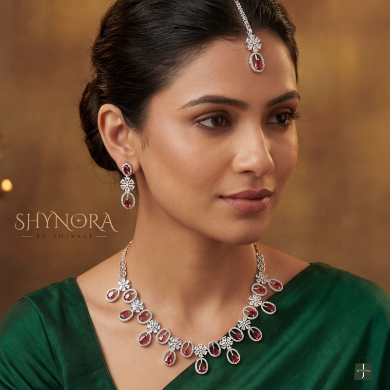 The Noor Ruby Oval Drops AD Necklace Set is a graceful blend of elegance and sparkle. Designed with shimmering ruby red oval drops framed in brilliant American Diamonds, this necklace features delicate floral accents that add softness and charm to the overall look.