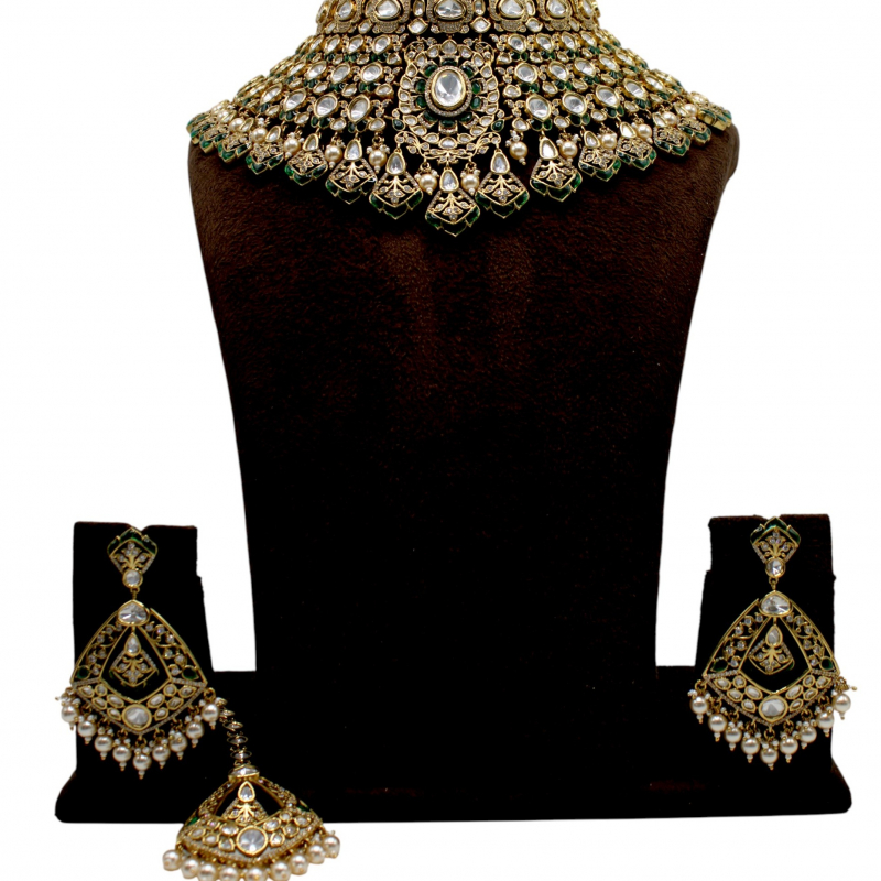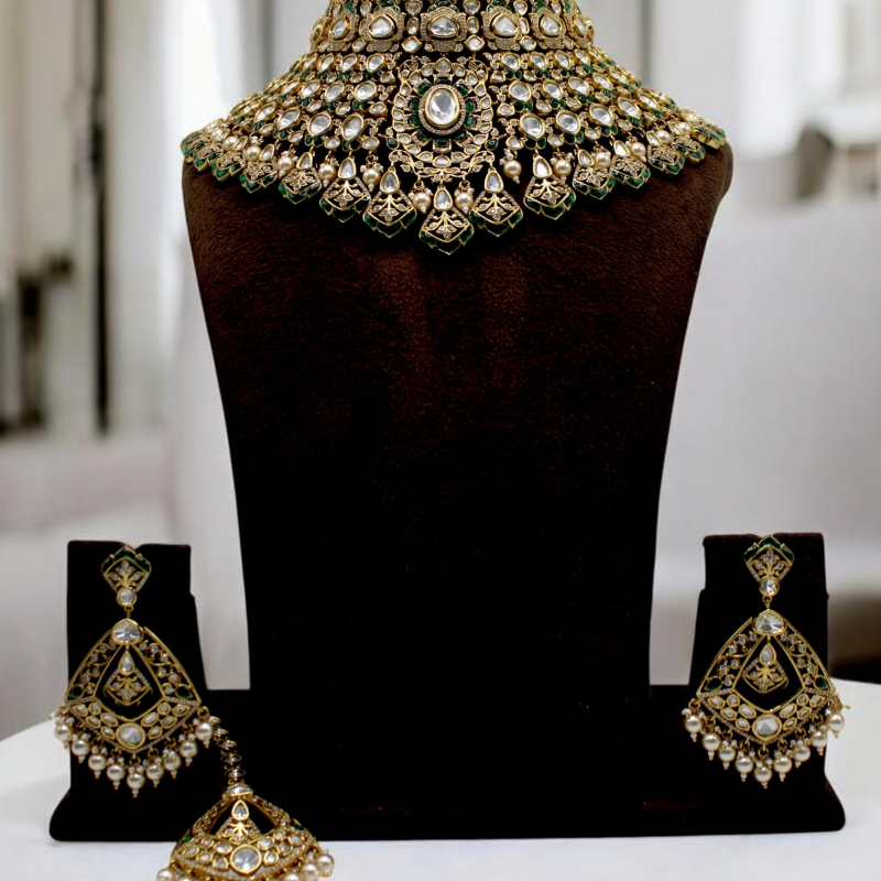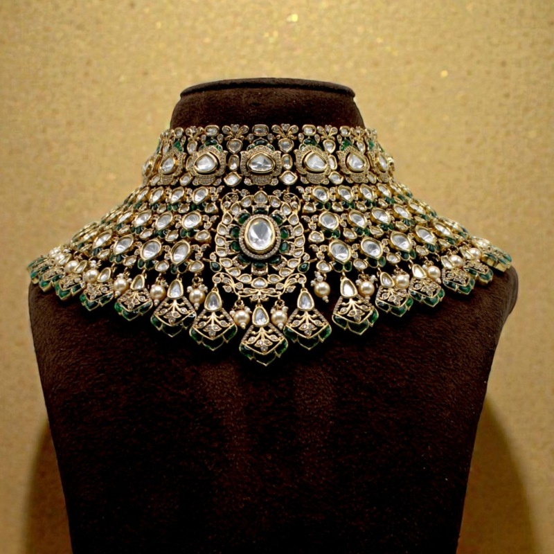 Exude timeless royalty with this opulent bridal choker set, crafted with intricate Kundan artistry and layered detailing. The necklace features a magnificent arrangement of clear uncut-style Kundan stones, highlighted with elegant emerald green accents along the borders. A striking central motif enhances the regal appeal, while delicate pearl drops add graceful movement and traditional charm.