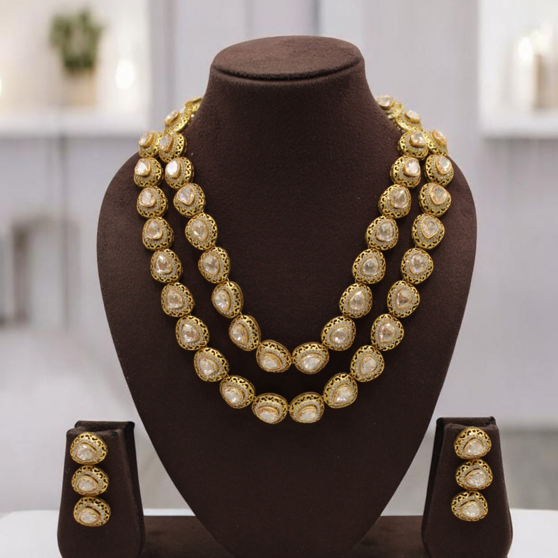 Add timeless elegance to your jewelry collection with the Noorika Double Layer Polki Necklace Set. Designed with two graceful strands of teardrop-shaped polki stones, this set reflects traditional charm blended with a royal finish. Each stone is beautifully framed in intricate antique gold detailing, creating a luxurious layered look.