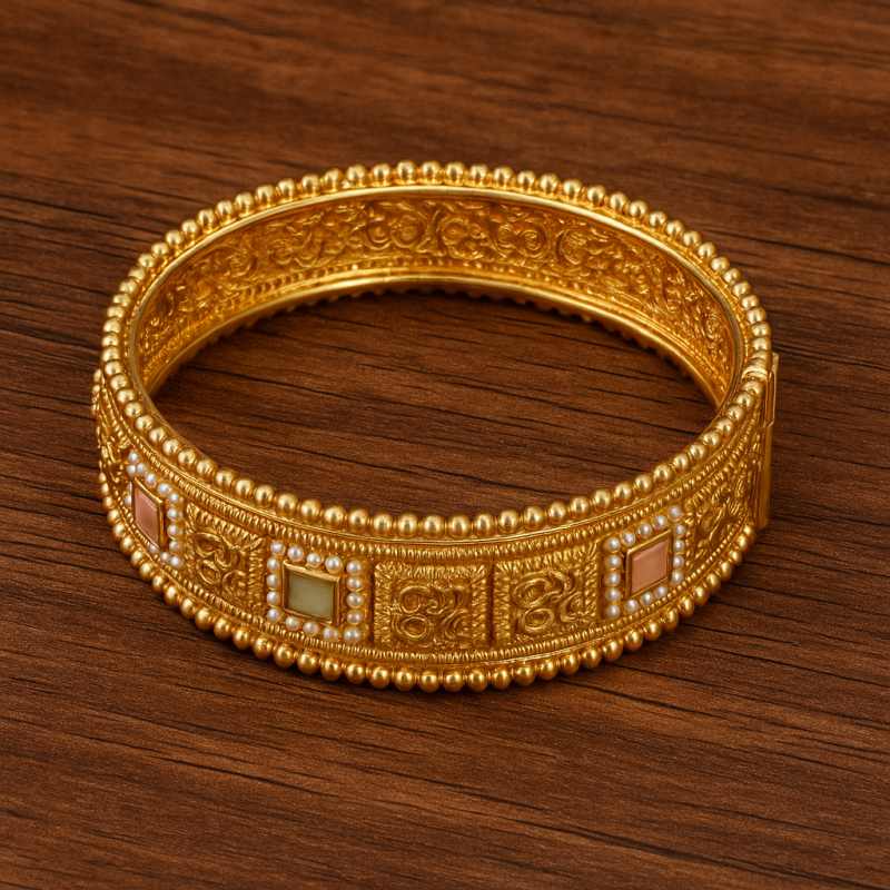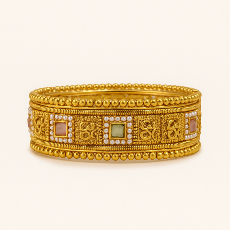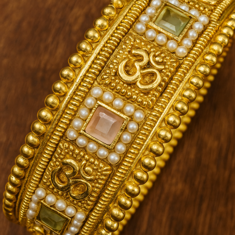 The Om Motif Gemstone Kada Bangle is a divine blend of tradition and spirituality. Intricately designed with embossed Om (ॐ) motifs, this bangle is adorned with pastel pink and emerald green gemstones surrounded by delicate pearl accents. The gold-polished finish enhances its regal charm, while the screw closure ensures a secure and comfortable fit. A perfect piece for festive and cultural occasions, this kada bangle adds both elegance and spiritual grace to your jewellery collection.