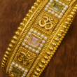 The Om Motif Gemstone Kada Bangle is a divine blend of tradition and spirituality. Intricately designed with embossed Om (ॐ) motifs, this bangle is adorned with pastel pink and emerald green gemstones surrounded by delicate pearl accents. The gold-polished finish enhances its regal charm, while the screw closure ensures a secure and comfortable fit. A perfect piece for festive and cultural occasions, this kada bangle adds both elegance and spiritual grace to your jewellery collection.