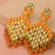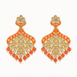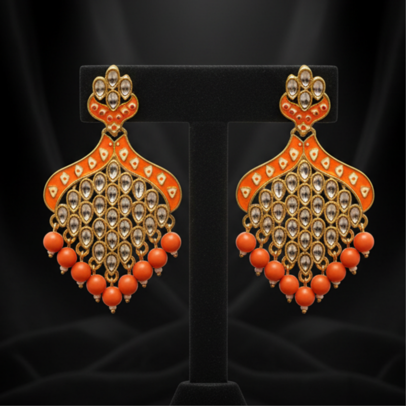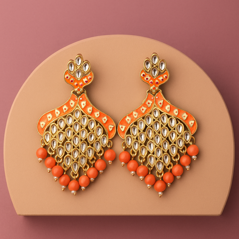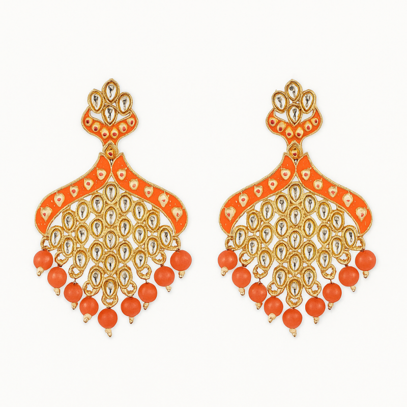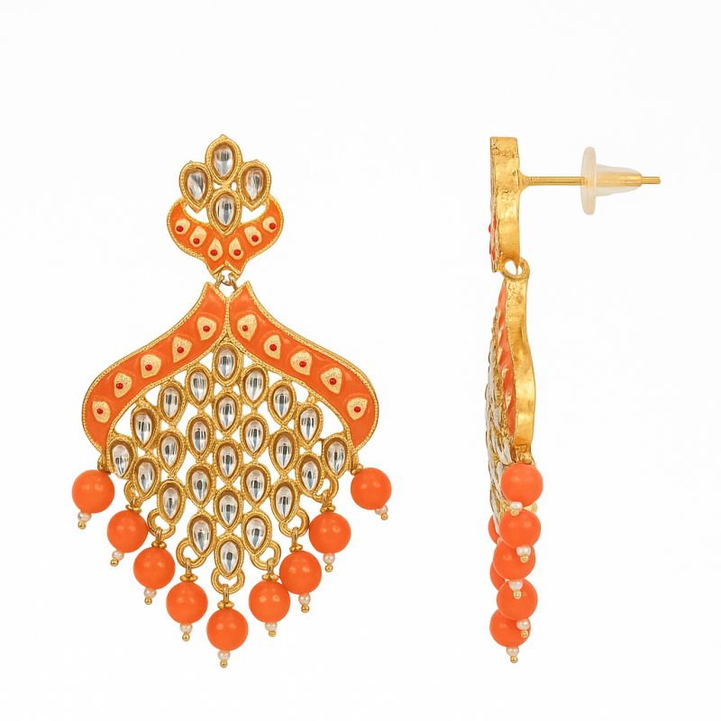 Add a vibrant touch of tradition to your look with this beautifully crafted Orange Meenakari Kundan Drop Earring. The earring features a striking orange enamel design adorned with finely set kundan stones, arranged in a teardrop pattern that radiates elegance. The bold orange beads hanging at the base add movement and a splash of color, making this piece perfect for festive and bridal occasions. Its intricate detailing and premium craftsmanship bring together heritage artistry and modern appeal. Pair it with ethnic sarees, lehengas, or fusion outfits to elevate your festive style.