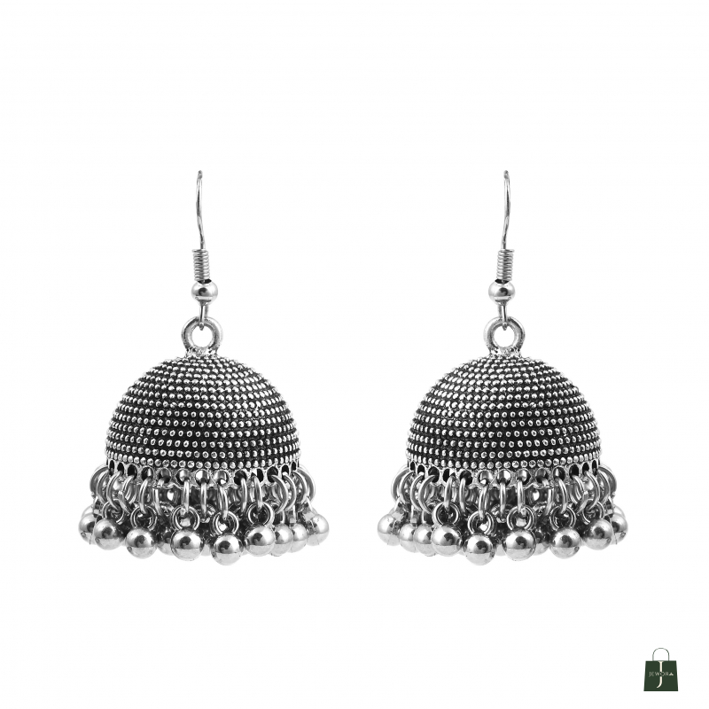 Classic oxidised jhumkas with dome detailing and bead danglers—perfect for festive and everyday ethnic wear.