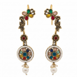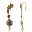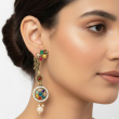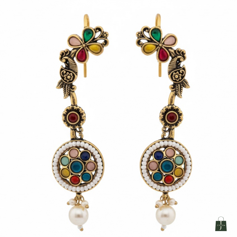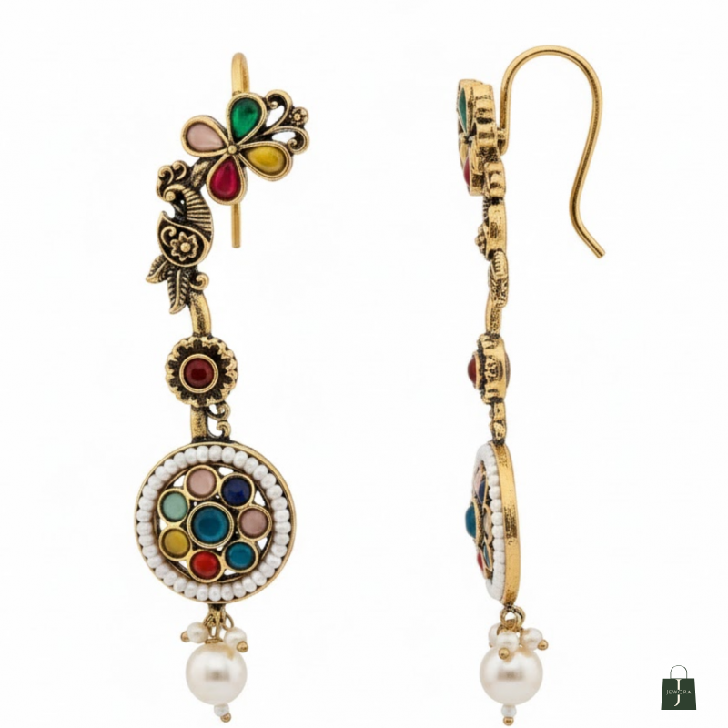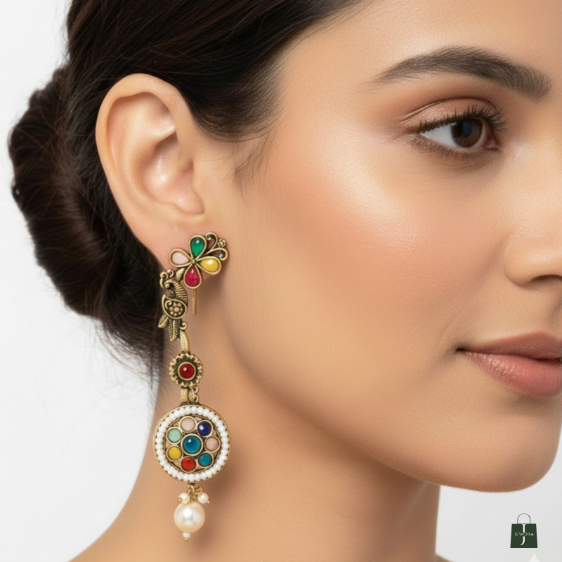 Add a vibrant touch of tradition to your jewellery collection with these Antique Gold Multi-Colour Enamel Dangle Earrings. Designed with stunning craftsmanship, these earrings feature a delicate peacock motif, colourful enamel floral patterns, and a round multi-stone centre bordered with tiny white beads. The elegant pearl drop at the bottom enhances their ethnic charm, making them an eye-catching accessory for weddings, festivals, and celebrations.