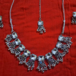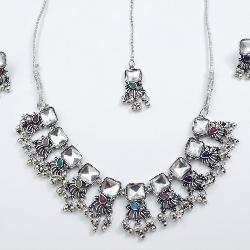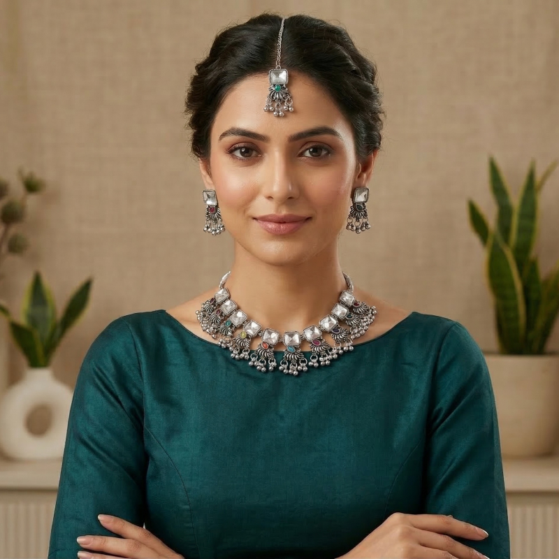 COMPLETE JEWELRY SET: This traditional oxidised silver-tone necklace set includes a statement choker necklace, matching jhumka earrings, and an elegant maang tikka for a coordinated ethnic look