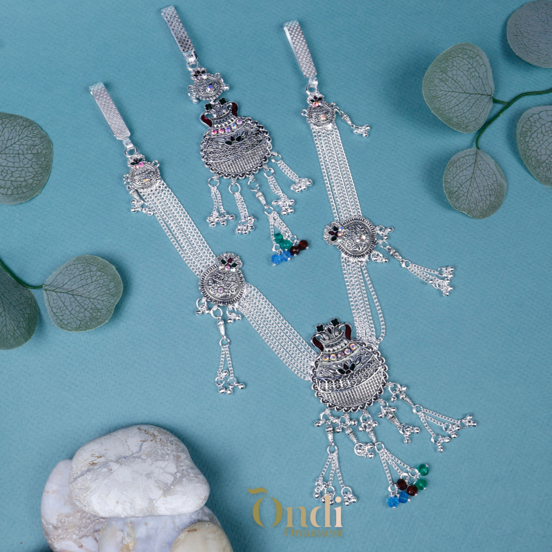 This elegant oxidised silver kamarbandh features a striking traditional kalash-inspired centerpiece beautifully detailed with intricate carvings and colorful stone accents. The multi-layer chain design on both sides adds richness and depth to the piece, while delicate dangling tassels and multicolor bead drops create graceful movement. Perfectly crafted to enhance the waistline, this kamarbandh pairs beautifully with sarees, lehengas, and festive outfits, adding a bold ethnic charm to your look.