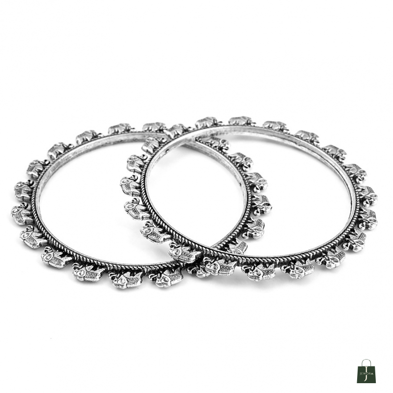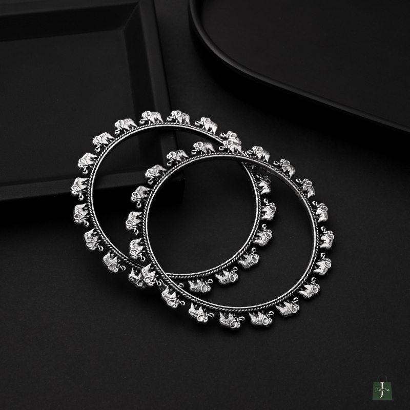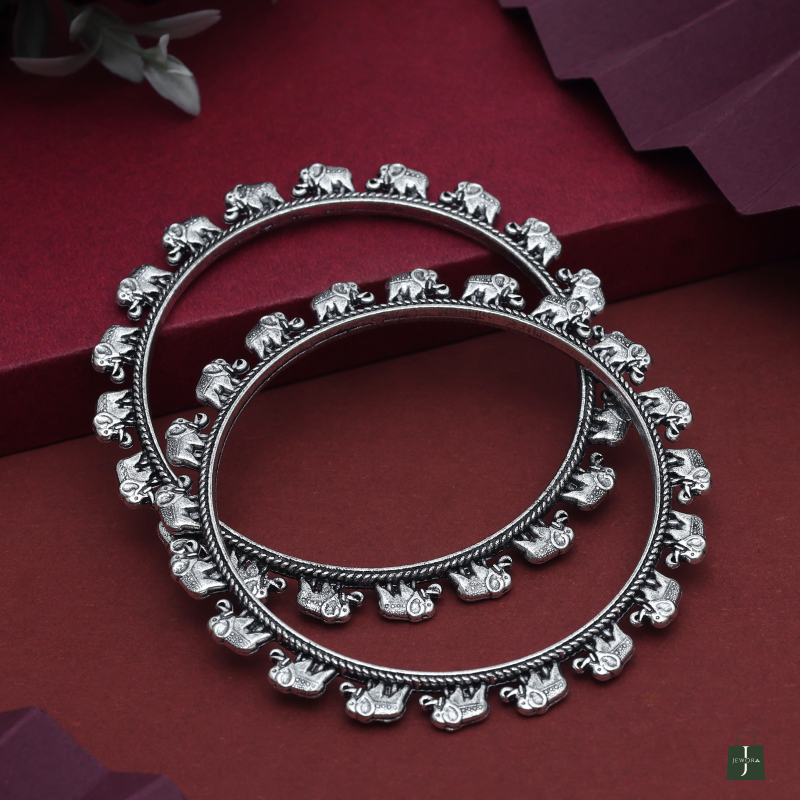 Add heritage charm to your look with this set of oxidised silver-plated bangles, detailed with elegant elephant motifs. Lightweight and versatile, they’re perfect for festive and ethnic wear.