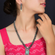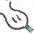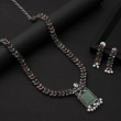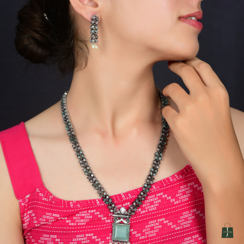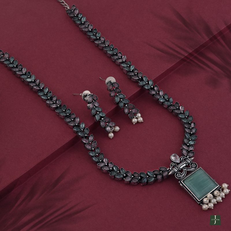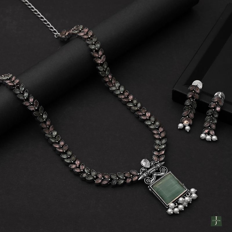 Bring elegance to your ethnic look with this oxidised necklace set featuring a green stone pendant, floral chain, and pearl drops. Paired with matching earrings, itβs perfect for festive occasions.