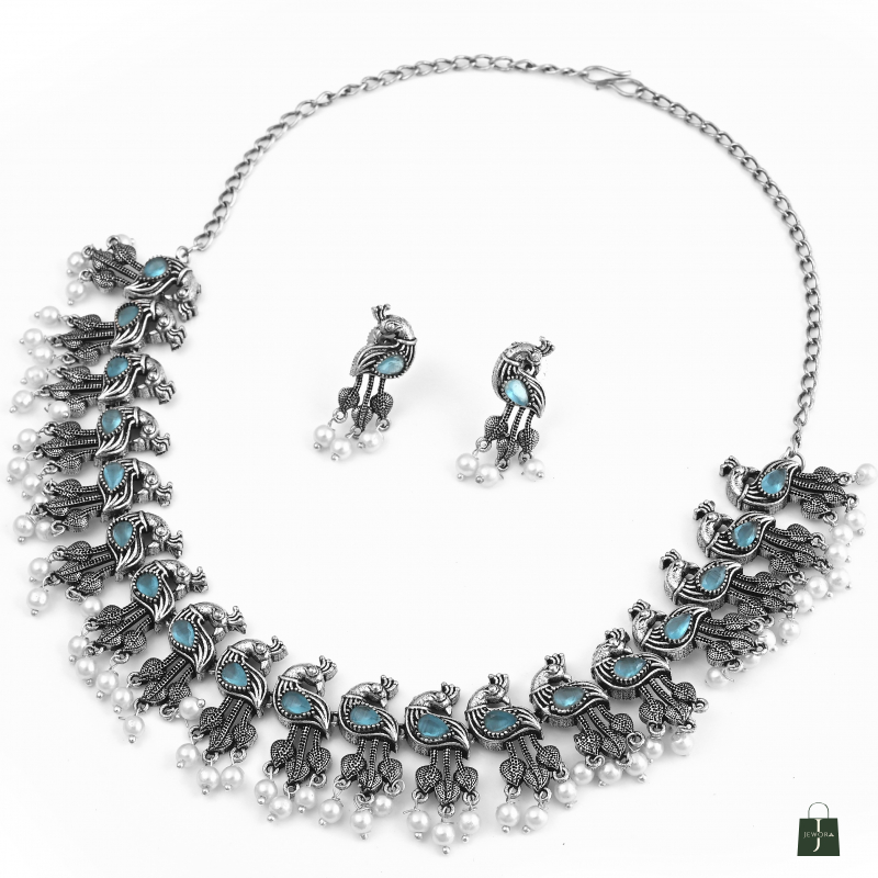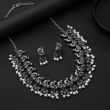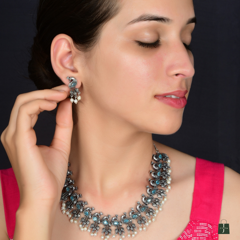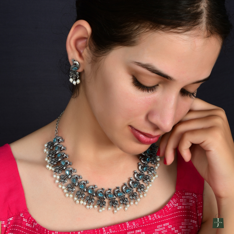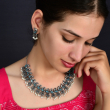 Traditional oxidized silver necklace with layered beadwork and a semi-circular design. Adjustable chain for a perfect festive fit