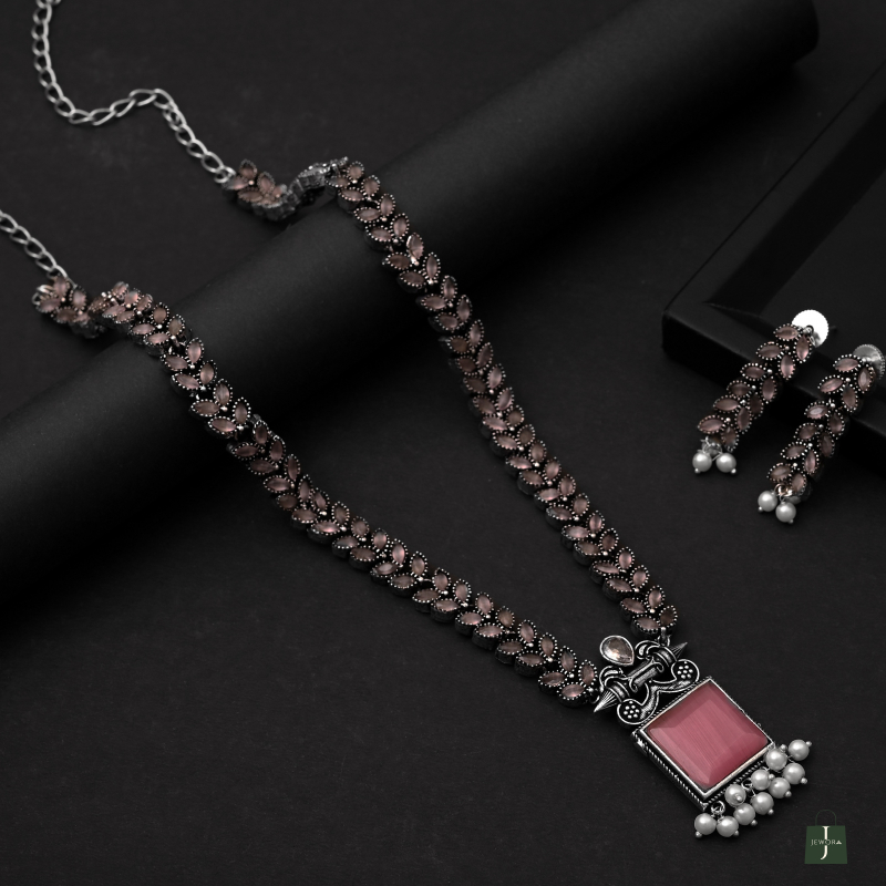 Bring elegance to your ethnic look with this oxidised necklace set featuring a pink stone pendant, floral chain, and pearl drops. Paired with matching earrings, itโs perfect for festive occasions.