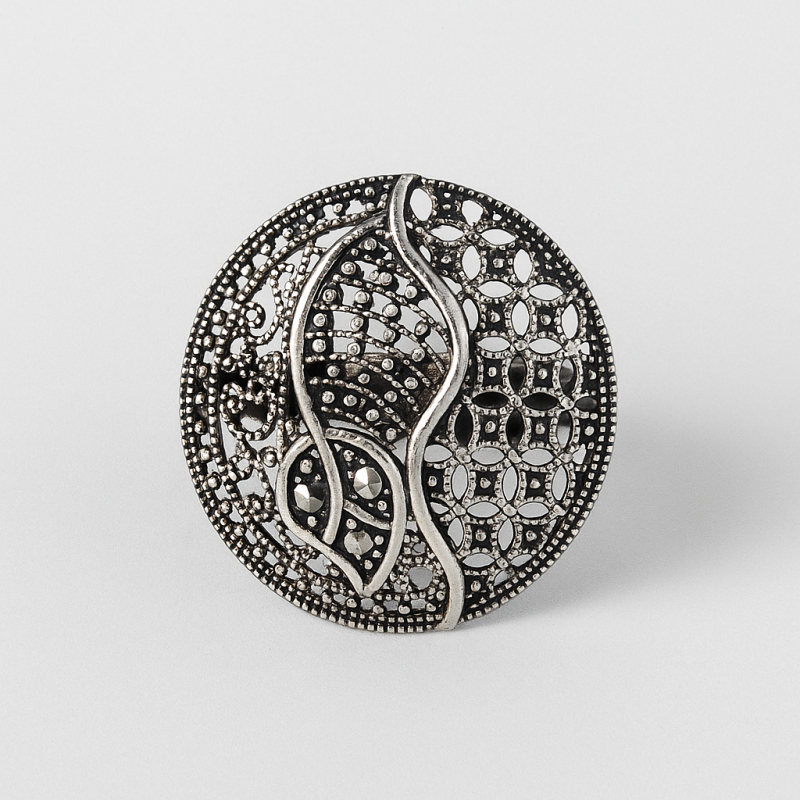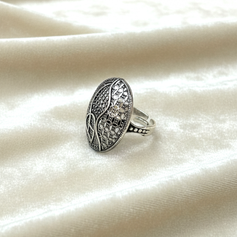 Oxidized Filigree Leaf Motif Cocktail Ring is a striking piece of handcrafted jewellery that beautifully combines traditional artistry with a bold design. The large circular frame features intricate filigree detailing with a prominent central leaf-inspired motif, giving it an earthy yet elegant appeal. Finished in oxidized silver, this ring adds a touch of vintage sophistication to any outfit.