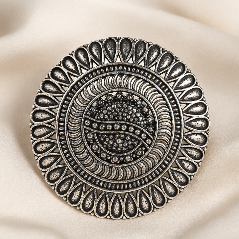 Oxidized Filigree Statement Cocktail Ring is a bold and intricately designed accessory that embodies the beauty of traditional Indian craftsmanship. Featuring a large circular base, the ring is decorated with layered patterns of petal-like motifs and concentric filigree detailing. The oxidized silver finish enhances its antique appeal, making it a versatile statement piece for everyday wear as well as festive occasions.