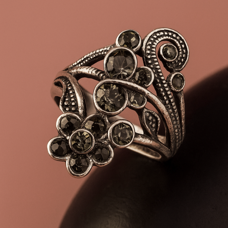 Crafted from high-quality alloy with an oxidized silver finish, this ring highlights precision in detailing and durability. The floral stone accents enhance its charm while the adjustable free-size band ensures a perfect fit. A perfect choice for women who love jewellery with heritage appeal and a modern twist.
