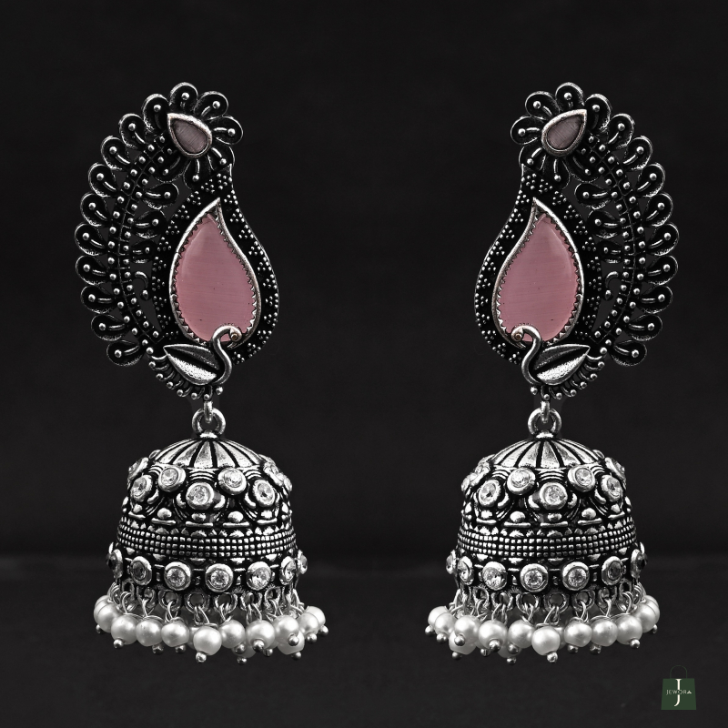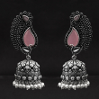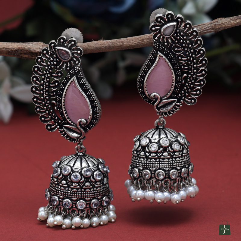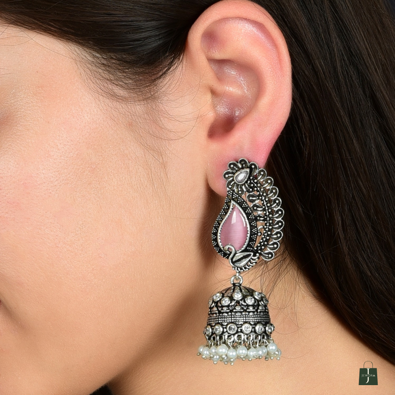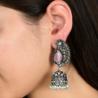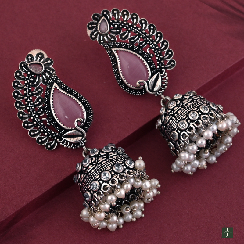 Traditional earrings with paisley tops, pink enamel, floral bell drops, and pearl accents—perfect for festive wear.
