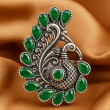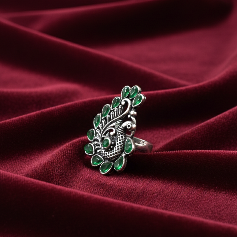 Oxidized Peacock Cocktail Ring is a stunning jewellery piece that beautifully combines heritage design with bold artistry. The ring features an intricately carved peacock motif adorned with gemstone accents, reflecting the richness of traditional Indian craftsmanship. Its unique design makes it a standout accessory, perfect for festive and cultural occasions.