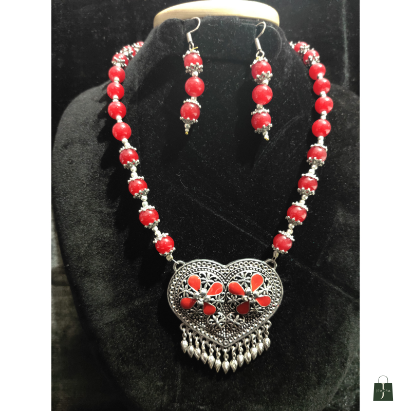 Oxidized red colour bead necklace with earrings