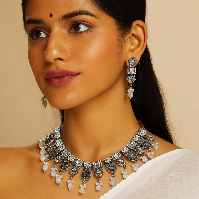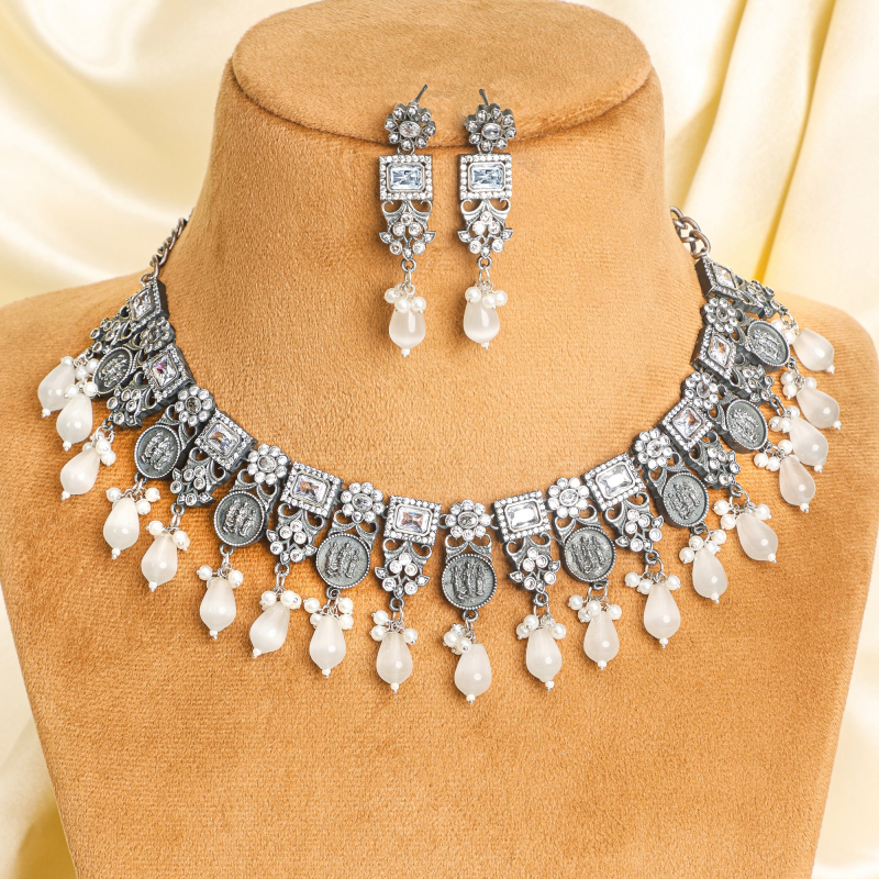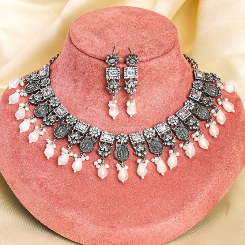 Oxidized German Silver necklace set for women's and girls outstanding German Silver choker necklace & earring set, Contemporary look which will fit with your whole wardrobe! It fall beautifully on the neckline giving you an elegant look.