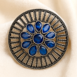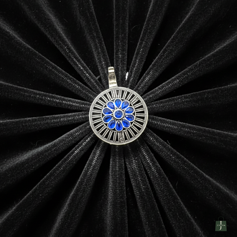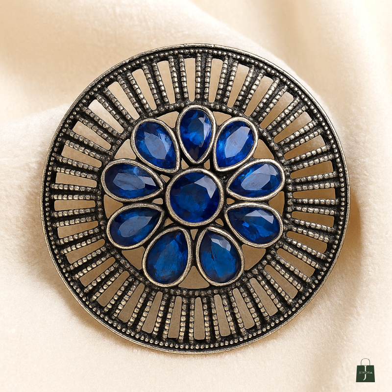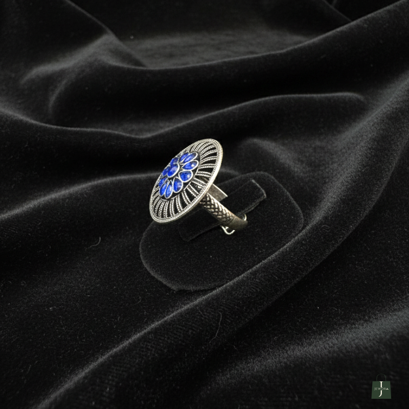 Oxidized Silver Ruby Floral Cocktail Ring is a statement piece that blends heritage charm with modern artistry. Designed in an oversized circular pattern, it showcases a radiant floral motif crafted from deep ruby red stones, highlighted with fine oxidized detailing around the edges. The bold design makes it a versatile accessory for festive, party, and bridal ensembles.