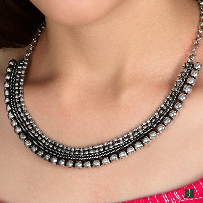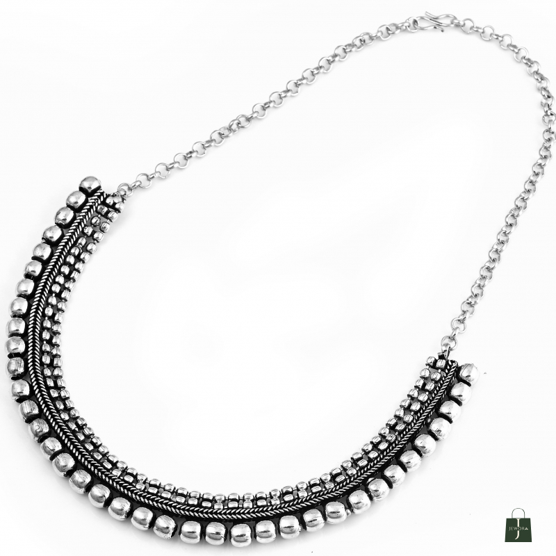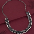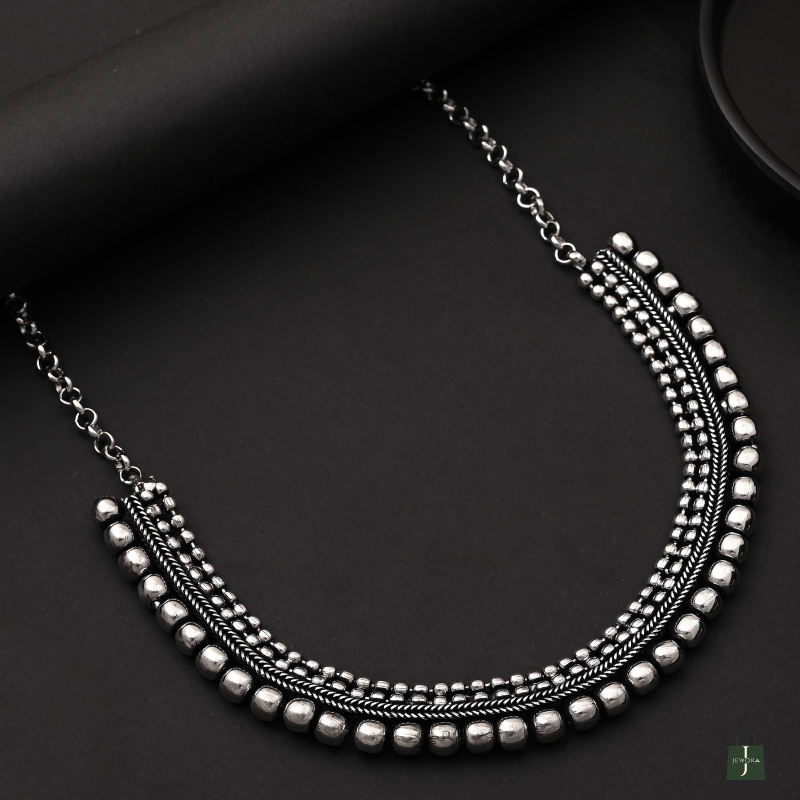 Traditional oxidized silver necklace with layered beadwork and a semi-circular design. Adjustable chain for a perfect festive fit