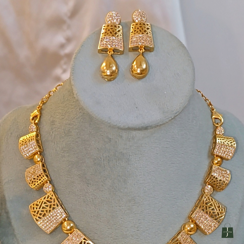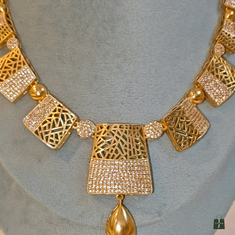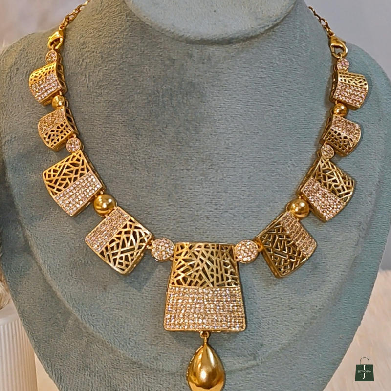 Elevate your jewelry collection with this luxurious designer necklace set, crafted to perfection with a blend of modern charm and traditional elegance. This statement piece is adorned with intricate cutwork, shimmering white stones, and bold golden drops that make it a true head-turner.