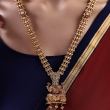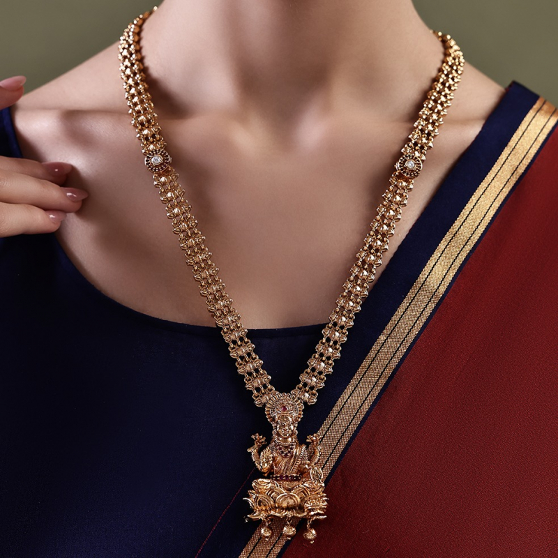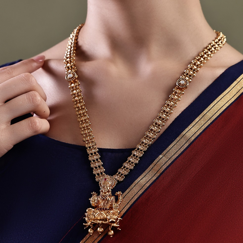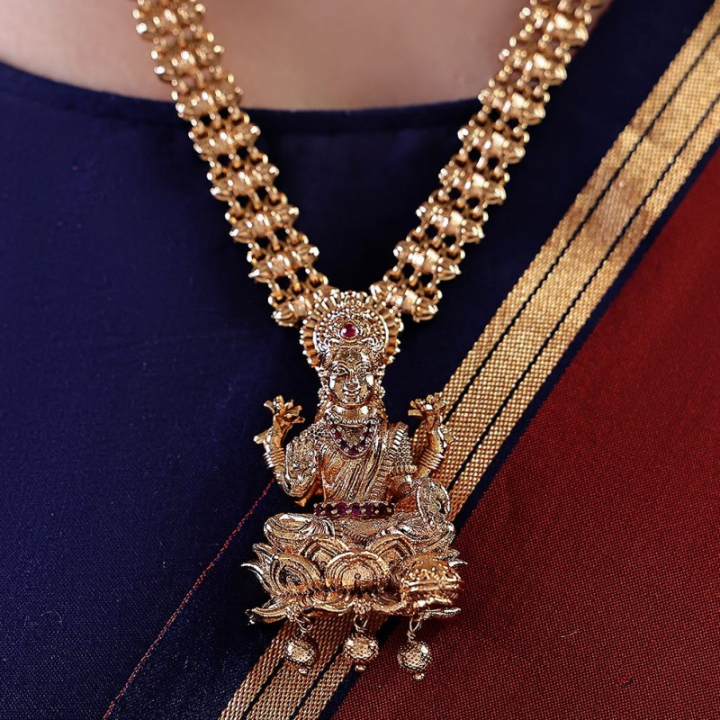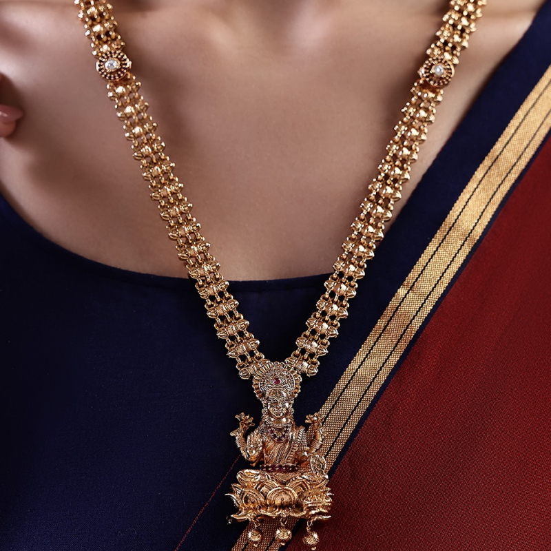 Embrace timeless tradition with this beautifully crafted temple necklace set, featuring a finely detailed Lakshmi pendant seated on a lotus motif. The chain is adorned with intricate patterns and subtle stone highlights, enhancing its rich and regal appeal. Finished in antique gold polish, this set reflects classic South Indian heritage design, making it a perfect choice for weddings, festive occasions, and traditional celebrations. Paired with matching jhumka earrings, it completes an elegant ethnic ensemble.