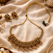 A celebration of heritage and craftsmanship, the Padmaraga Necklace is sculpted in a rich antique gold finish, reflecting the grandeur of traditional temple jewellery. Intricately designed motifs flow seamlessly to create a bold yet graceful silhouette, showcasing timeless artistry in every detail.