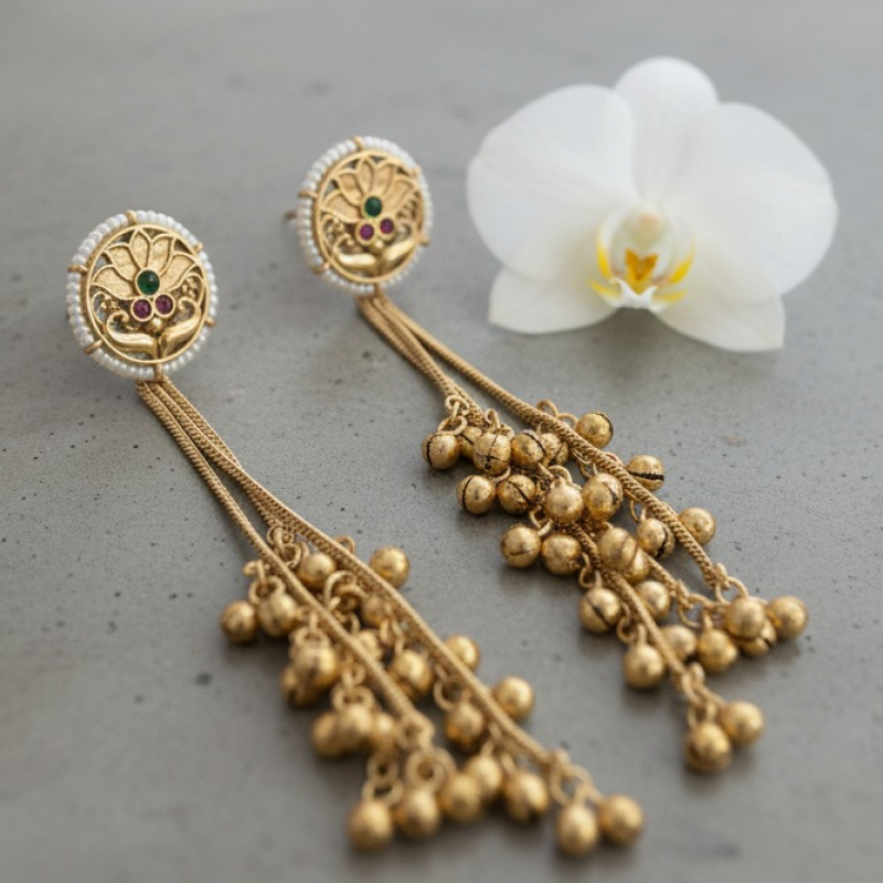 Elevate your traditional jewellery collection with the Padmika Antique Gold Tassel Earrings — a graceful blend of floral artistry and timeless craftsmanship. The round stud features an intricate lotus-inspired motif, symbolizing purity and elegance, delicately carved in antique gold finish.
