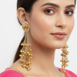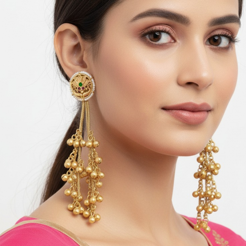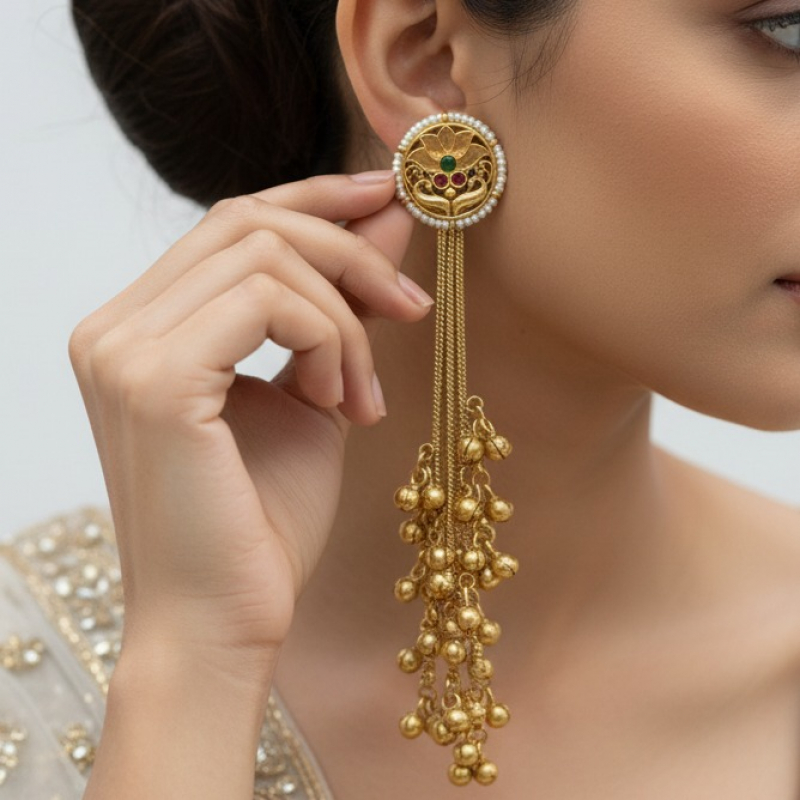 Flowing from the stud are multiple sleek gold chains that cascade into clusters of antique gold beads, creating a dramatic tassel effect with graceful movement. Perfect for weddings, festive occasions, and cultural celebrations, these earrings offer statement elegance without being overpowering.