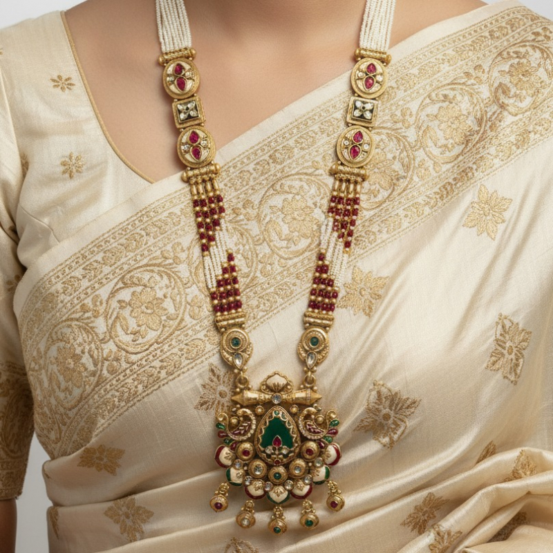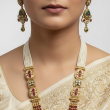 Celebrate heritage craftsmanship with the Rajnidhi Panchrangi Temple Long Haar Set, a majestic blend of traditional temple artistry and vibrant beadwork. This long necklace features layered white pearl strands at the top, transitioning into rich ruby pink and emerald green bead strings that add depth and colour contrast.