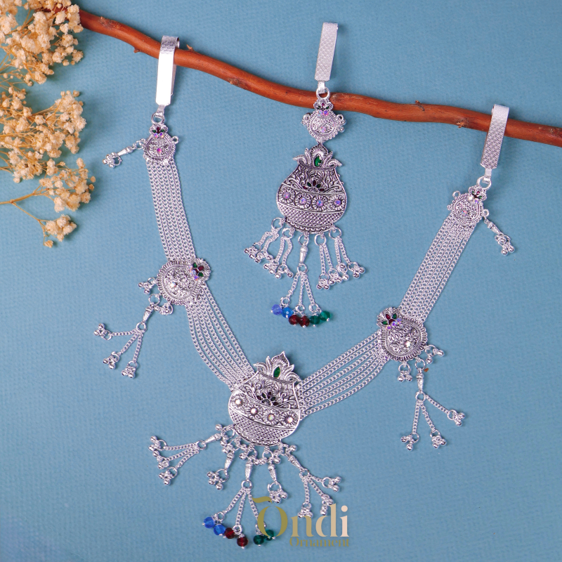 This elegant oxidised silver kamarbandh showcases a beautifully crafted peacock-inspired kalash centerpiece that reflects traditional Indian artistry. The design is enhanced with multiple delicate chain strands on both sides, creating a layered and graceful waist accessory. Intricate carvings, floral side motifs, and dangling tassel charms add movement and elegance, while colorful bead accents bring a vibrant touch. Perfect for styling with sarees, lehengas, and festive outfits, this kamarbandh adds a royal ethnic charm to any traditional look.