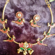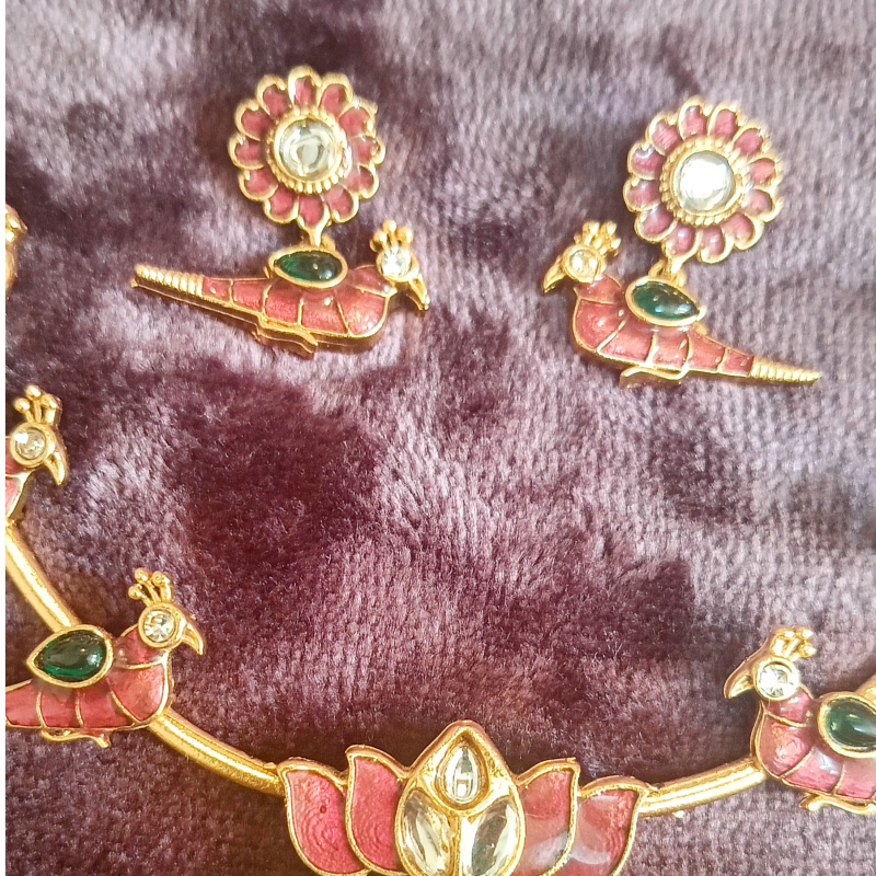 Lotus Parrot Hasli Necklace features a firm hasli-style base highlighted with lotus and Bird motifs inspired by Traditional art. Gold and pearl beads adds beauty to it.The base metal used is Copper brass alloy with backchain and Matching bird earrings.