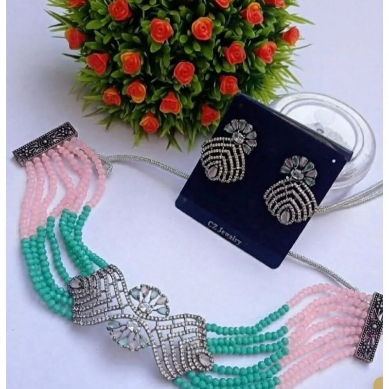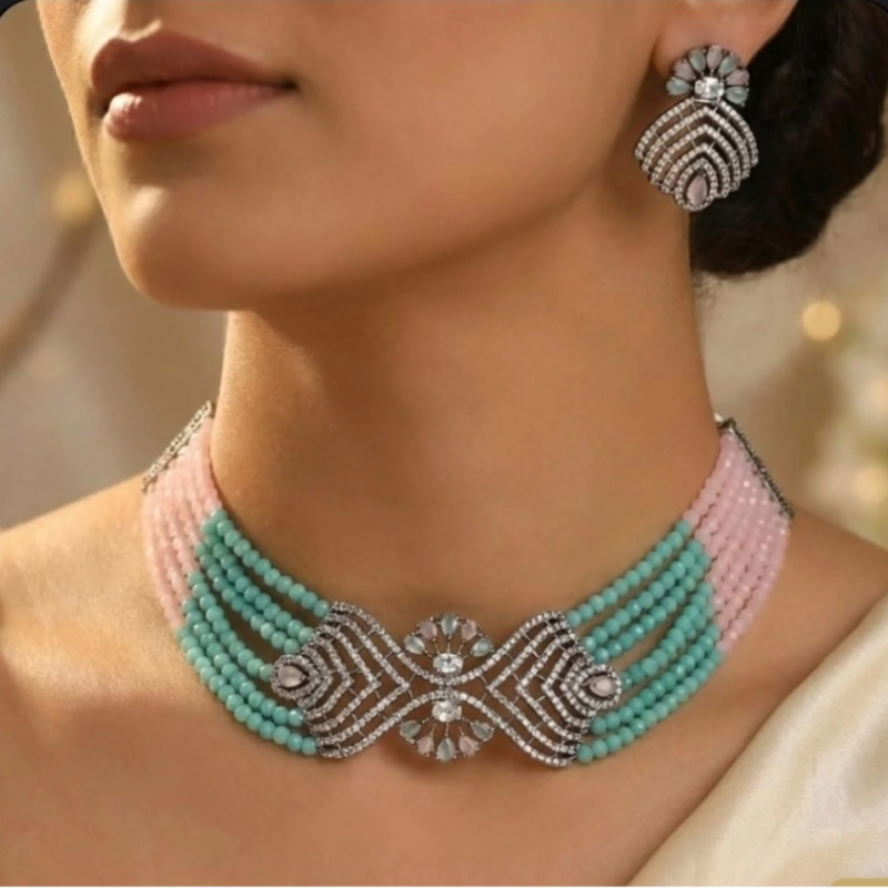 Elevate your ethnic look with this exquisite pastel beaded choker necklace set, featuring soft aqua and blush pink bead strands paired with a stunning kundan-style centerpiece and matching statement earrings. The intricate stone detailing adds a regal charm, making this set perfect for weddings, festive occasions, receptions, and elegant celebrations. A timeless piece that blends grace with modern sophistication.