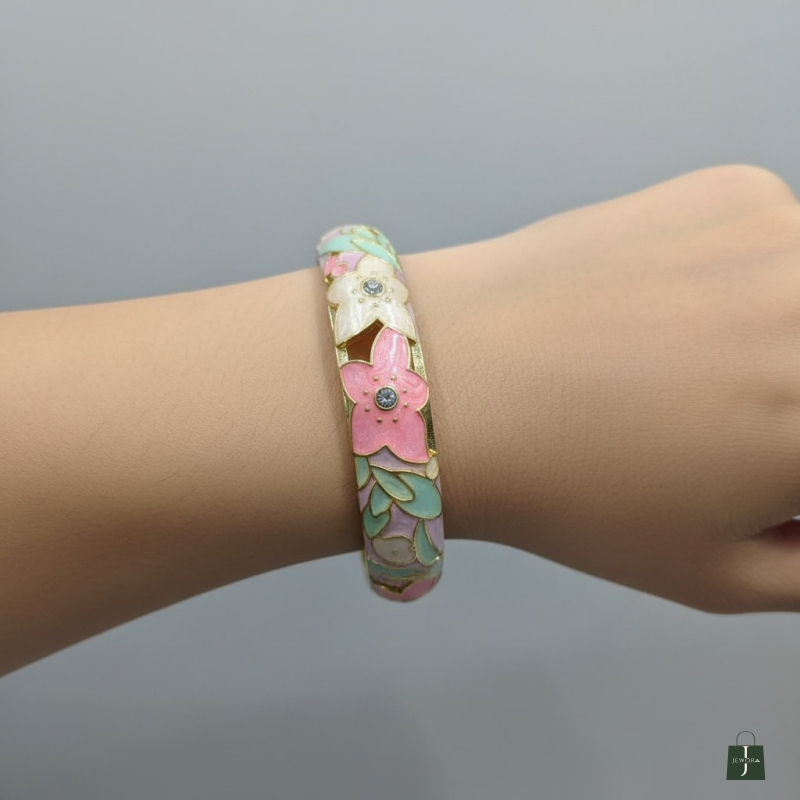 Bring a touch of timeless, springtime elegance to your wrist with our stunning Pastel Enamel Floral Kada. This exquisite piece combines the traditional silhouette of a classic Indian kada with modern, vibrant hand-painted enamel work and a premium anti-tarnish finish. Designed for the contemporary woman, this bangle adds a pop of sophisticated color and brilliance, making it perfect for daily wear or special occasions.