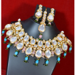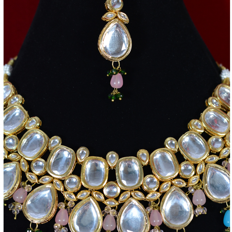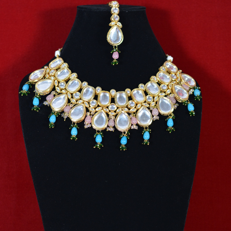 This pastel Kundan choker necklace set is crafted with finely polished Kundan stones set on a rich gold-toned base, highlighted by soft pink and blue bead drops. The pastel hues create a fresh, elegant contrast, giving the jewelry a premium yet graceful appeal. Designed to sit perfectly on the neckline, it offers bridal elegance while remaining lightweight, comfortable, and ideal for weddings, festive occasions, and refined ethnic styling at an affordable price.