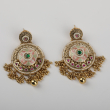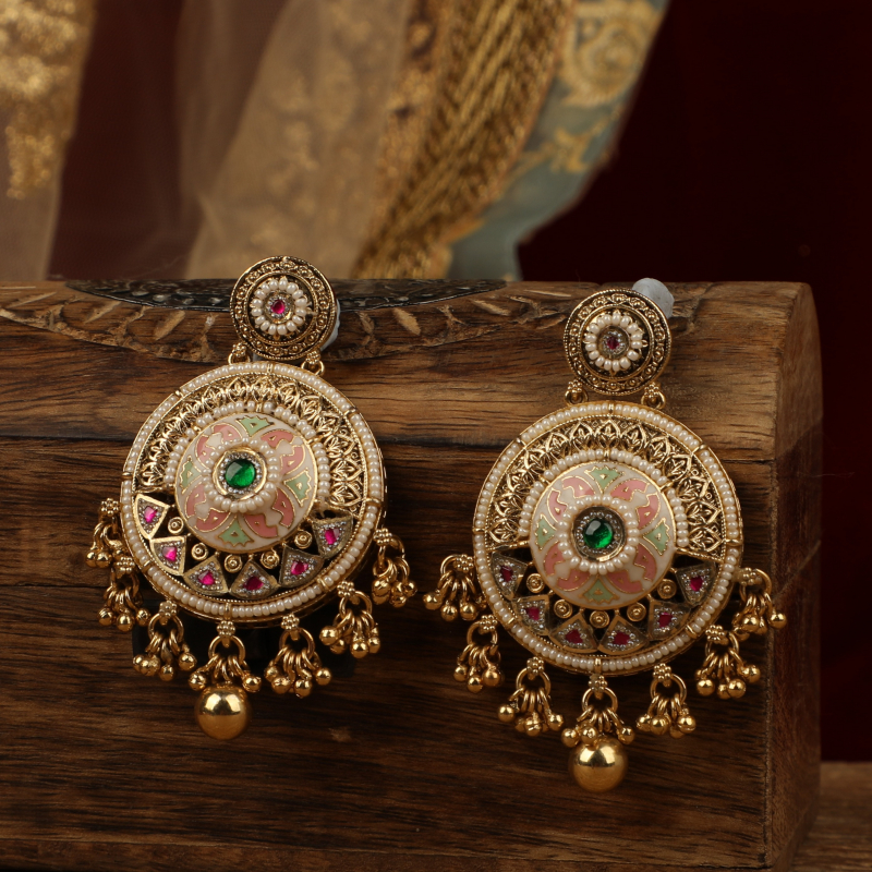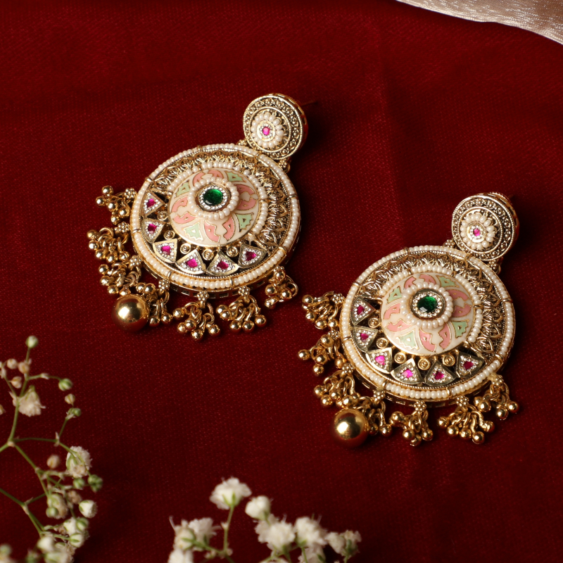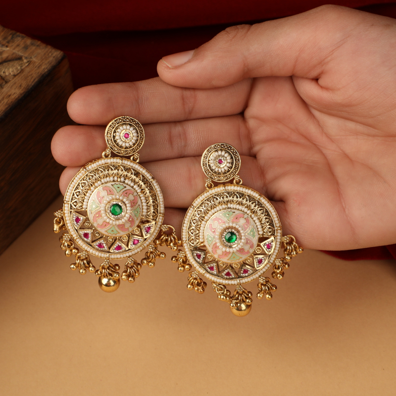 Elevate your festive jewellery collection with these exquisitely handcrafted circular statement earrings, inspired by classic Indian artistry. The design features a delicately enamelled centre in soft pastel hues, accented with a rich green stone at the heart, symbolising harmony and grace. Intricate filigree work and pearl detailing frame the motif beautifully, creating depth and refined elegance.