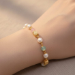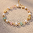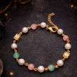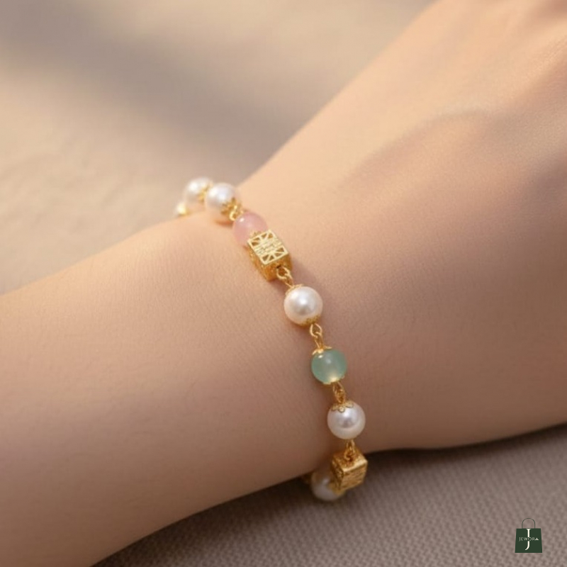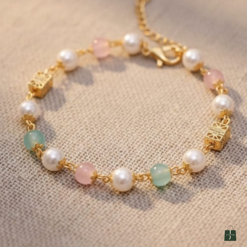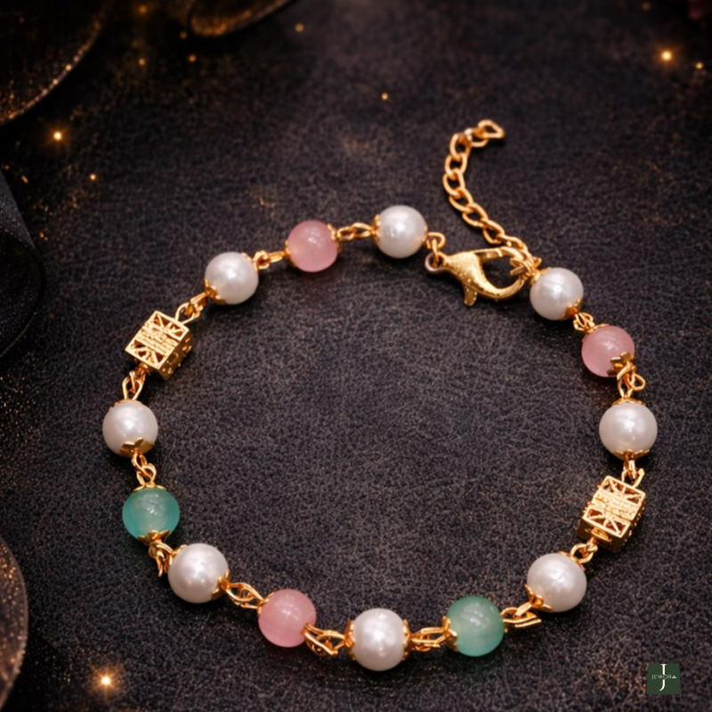 A delicate and charming bracelet crafted with luminous white pearls paired beautifully with soft pastel beads in blush pink and mint green tones. Accented with elegant gold-toned geometric charms, this bracelet offers a graceful blend of femininity and modern style. Lightweight and versatile, it is perfect for daily wear, brunch outings, festive casual looks, and gifting. Its soft color palette makes it ideal for both ethnic and western outfits.