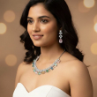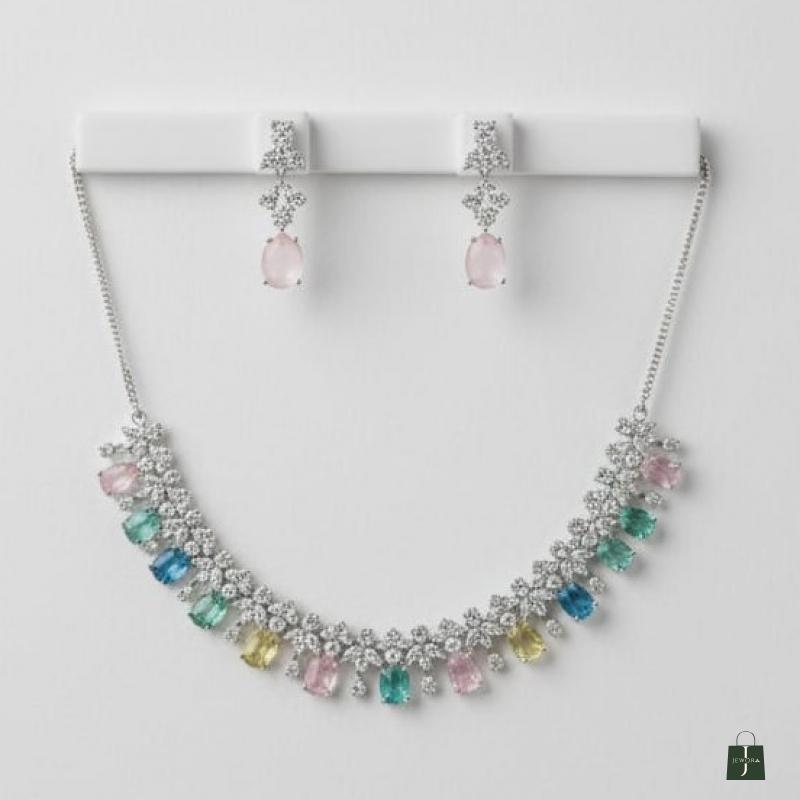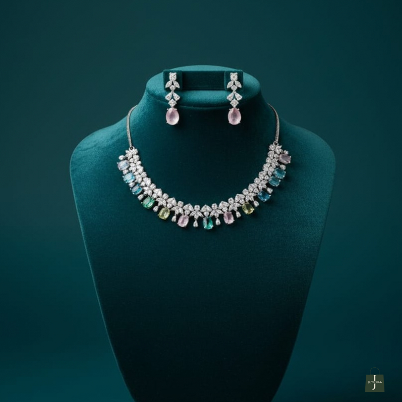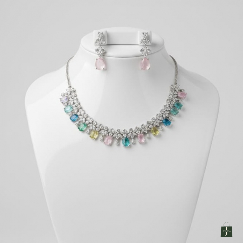 The silver-tone finish enhances the sparkle of the crystals, while the vibrant gemstone drops create a graceful and luxurious silhouette. Paired with matching drop earrings, this set is perfect for weddings, receptions, cocktail evenings, and festive celebrations.