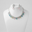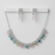 Add a touch of refined glamour to your collection with the Pastel Royale Crystal Collar Necklace Set. Designed with shimmering white crystal clusters, this elegant collar-style necklace is beautifully accented with delicate multicolor teardrop stones in soft pastel shades of green, blue, pink, and yellow.