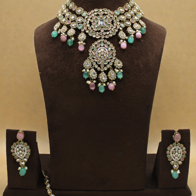 Introducing the elegant Pastel Royale Kundan Bridal Choker Set, a perfect blend of royal charm and soft feminine hues. This intricately crafted choker features layered kundan stone work arranged in floral and circular motifs, highlighted with mint green and blush pink bead drops for a refreshing pastel look.