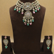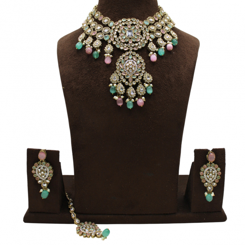 The central pendant design enhances the grandeur, while the matching earrings and maang tikka complete the bridal-ready ensemble. Ideal for day weddings, engagement ceremonies, haldi, or pastel-themed bridal looks, this set adds a soft yet regal touch to your outfit.