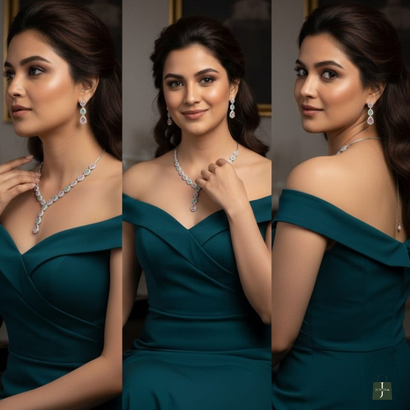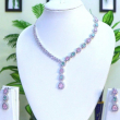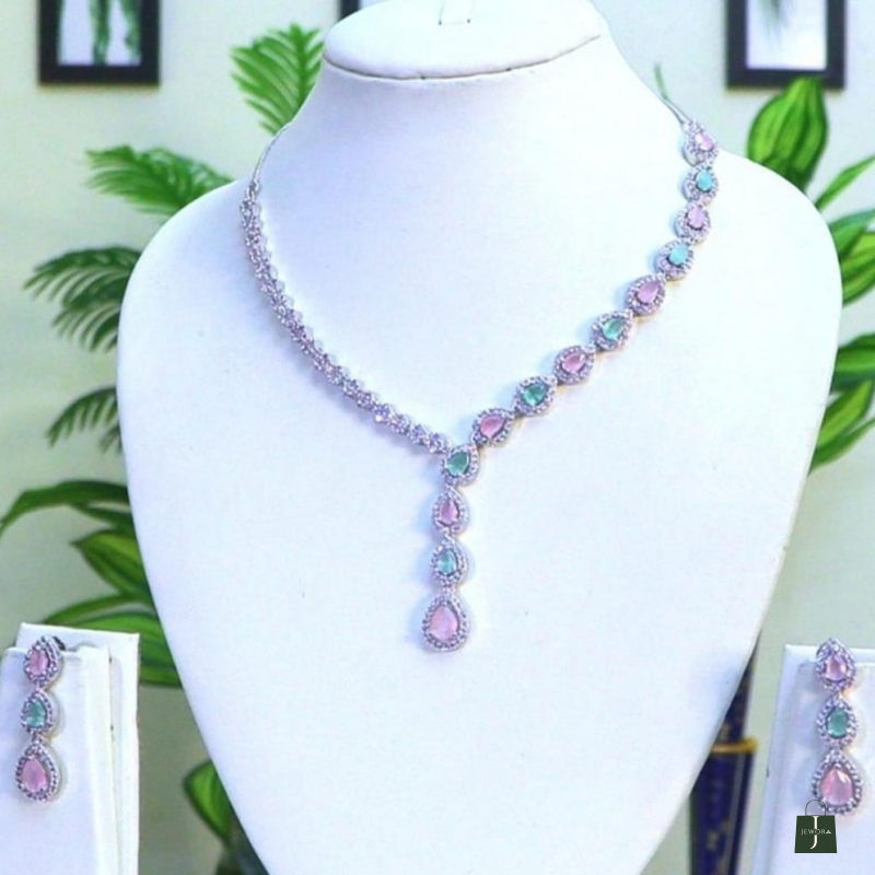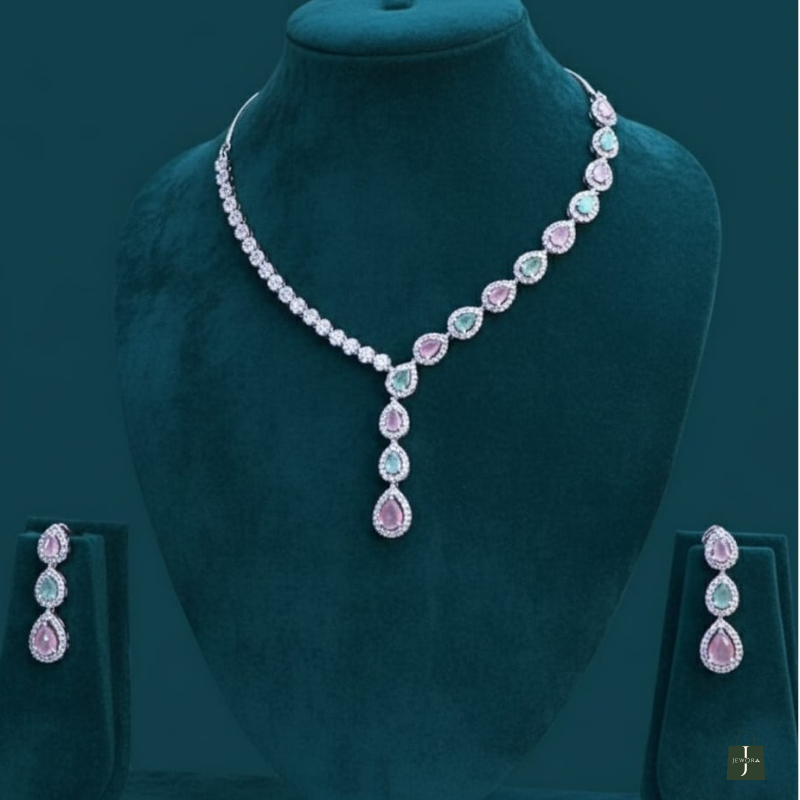 Elevate your elegance with this luxurious pastel crystal necklace and matching earrings set. Designed with alternating pear-shaped stones in soft pink and refreshing mint green tones, this set creates a refined yet eye-catching statement.