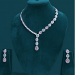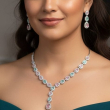 The necklace features a sparkling line of round brilliant crystals on one side that transitions into a sequence of halo-framed teardrop stones, finishing with a delicate drop pendant for added glamour. The matching drop earrings mirror the elegant layered teardrop design, ensuring a perfectly coordinated look.