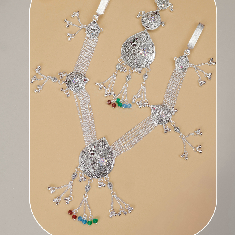 This elegant oxidised silver kamarbandh features a beautifully crafted leaf-shaped centerpiece inspired by traditional Indian motifs. The intricate carvings on the leaf design add a graceful and artistic appeal. Multiple delicate chain strands extend from both sides, creating a rich layered look around the waist. Dangling tassel chains and multicolor bead drops enhance the movement and vibrancy of the design. Perfect for pairing with sarees, lehengas, and festive outfits, this kamarbandh adds a stylish ethnic charm to any traditional look.