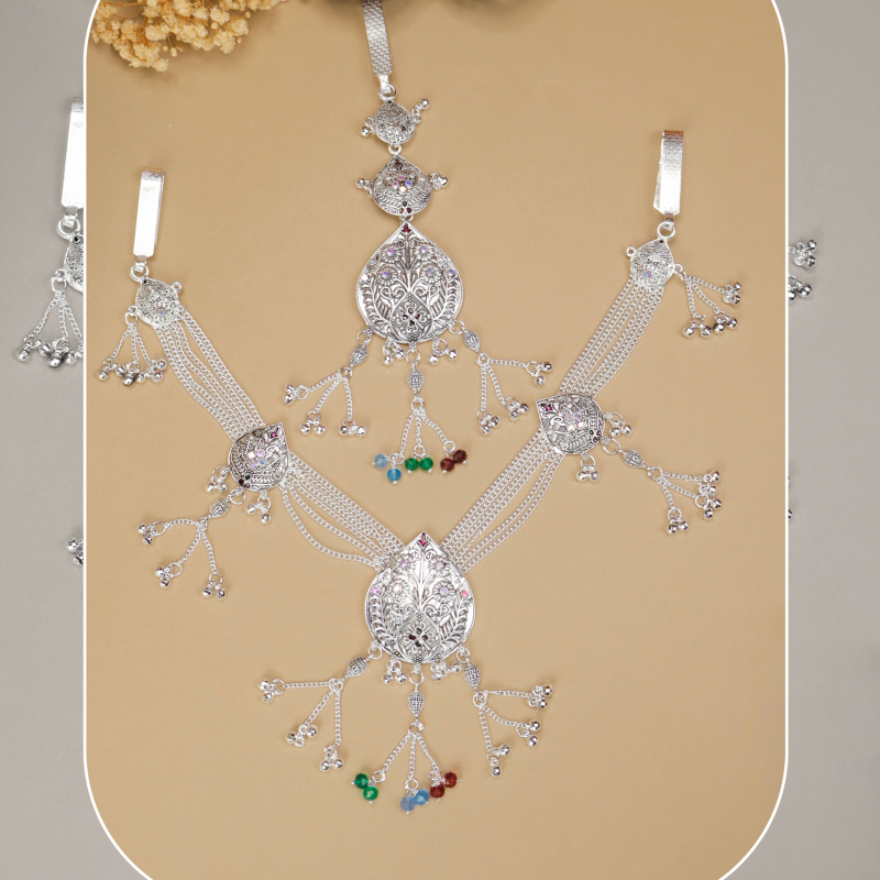 This elegant oxidised silver kamarbandh showcases a beautifully carved leaf-inspired centerpiece that reflects traditional Indian craftsmanship. The intricate patterns on the leaf motif give the piece a graceful and artistic appeal. Multiple delicate chain strands on both sides create a layered waist design, while dangling tassel chains and multicolor bead drops add vibrant movement and charm. Perfect for styling with sarees, lehengas, and festive outfits, this kamarbandh enhances the waistline and adds a timeless ethnic touch