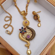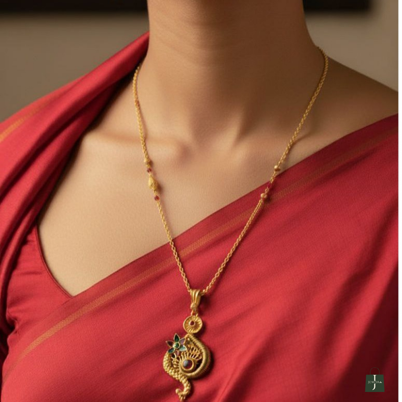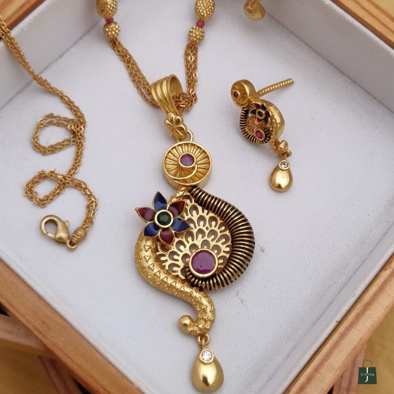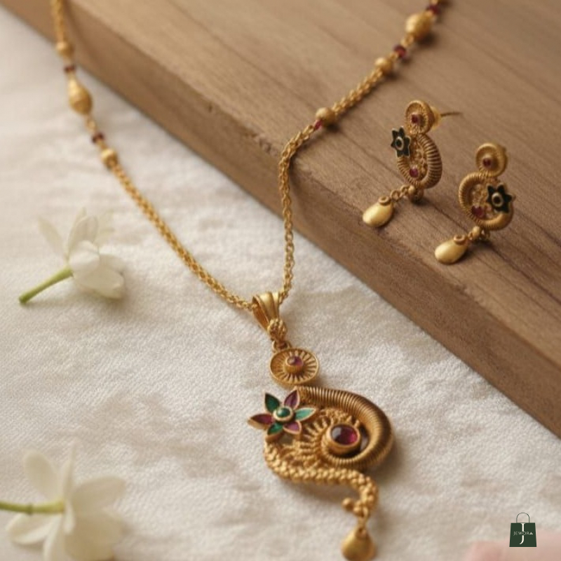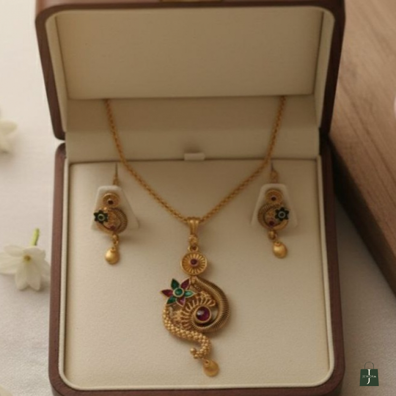 The Peacock Grace Ruby Floral Necklace Set is a stunning traditional jewellery piece inspired by the elegance of the peacock and floral motifs. The pendant features a graceful peacock-shaped curve with intricate engraved textures, accented with a blooming enamel flower and rich ruby-colored stones. A spiral coil detail adds depth and a handcrafted temple-jewellery feel. The teardrop charm with a sparkling white stone enhances the luxurious finish.
