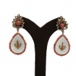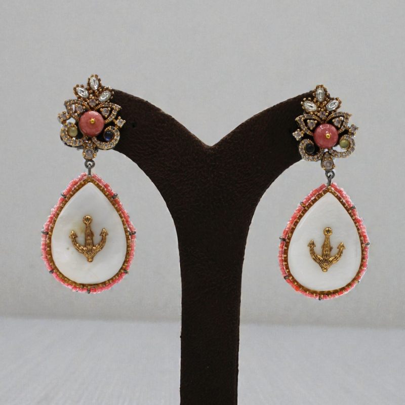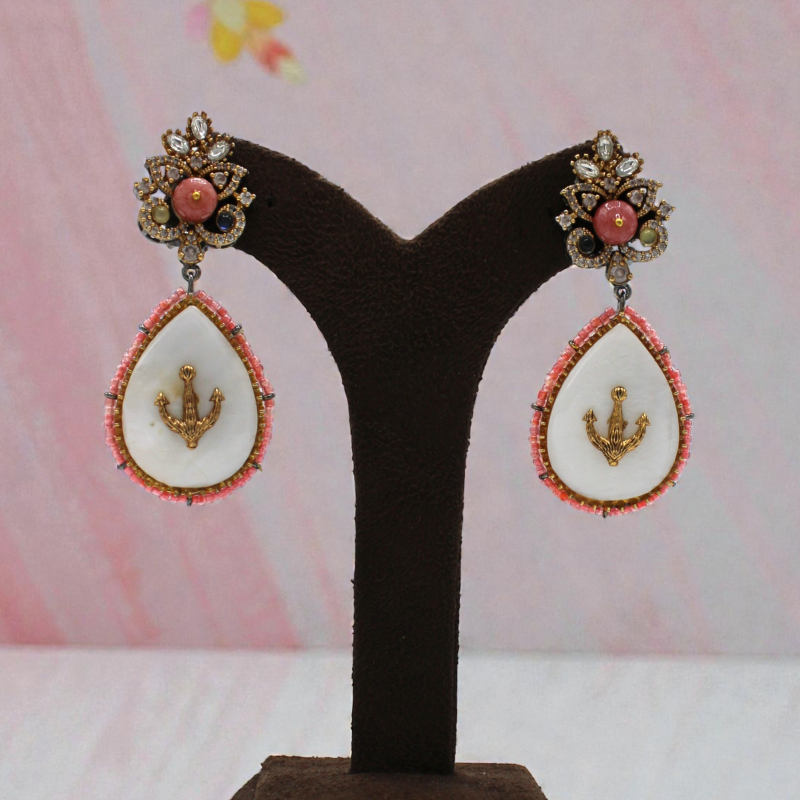 These unique statement earrings feature a beautifully carved white teardrop stone highlighted with a delicate golden anchor motif at the center. The drop is framed with fine pink bead detailing, adding a soft contrast to the elegant design. The upper stud portion showcases a floral-inspired arrangement of pink, blue, and white accent stones, giving the earrings a rich designer appeal. Perfect for festive occasions, fusion wear, and special gatherings.