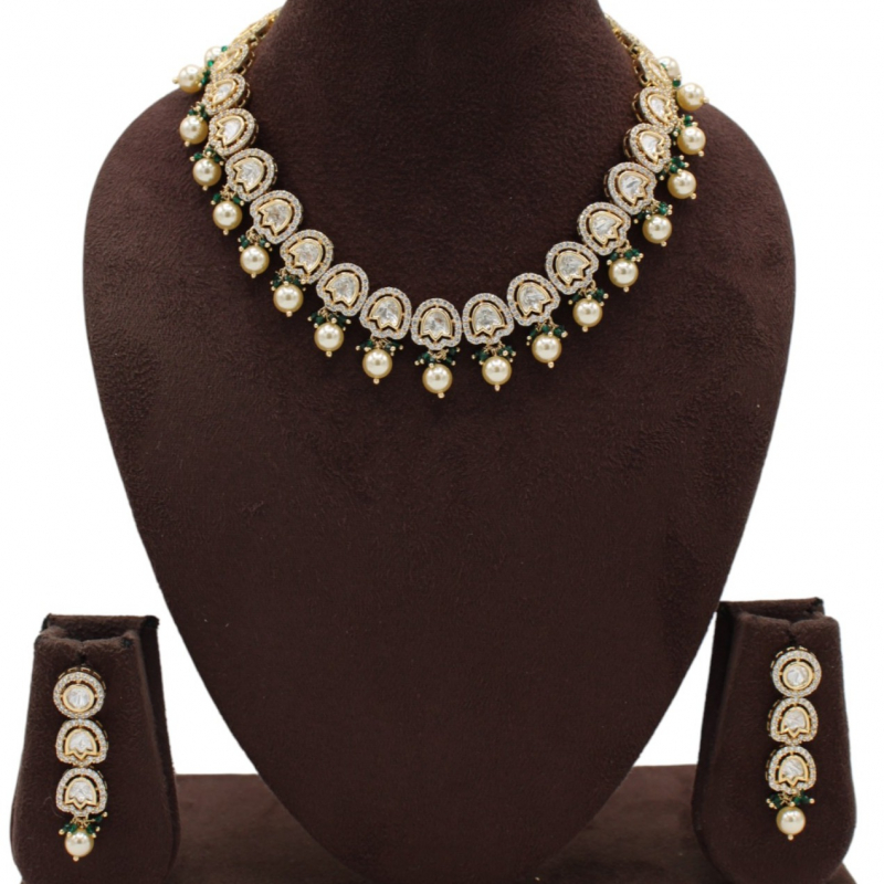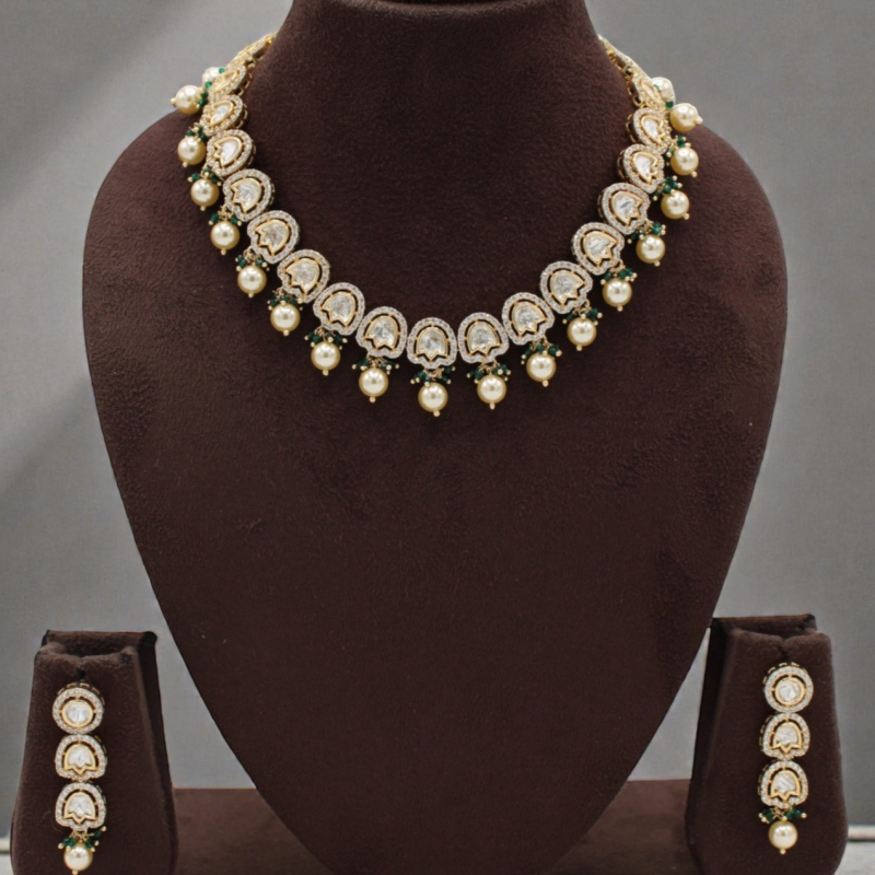 Each stone is beautifully framed with delicate detailing and finished with lustrous pearl drops that add charm and soft movement. Subtle green bead accents enhance the design, giving it a classic royal appeal without being overly heavy.